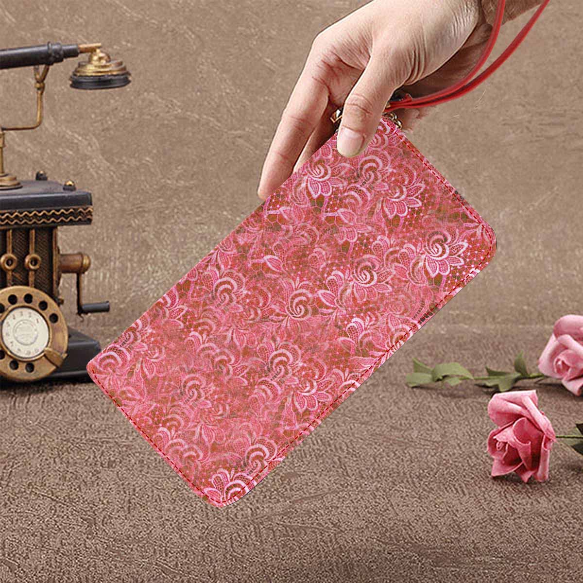 Victorian lace print womens wallet, clutch purse, red trim, design 33