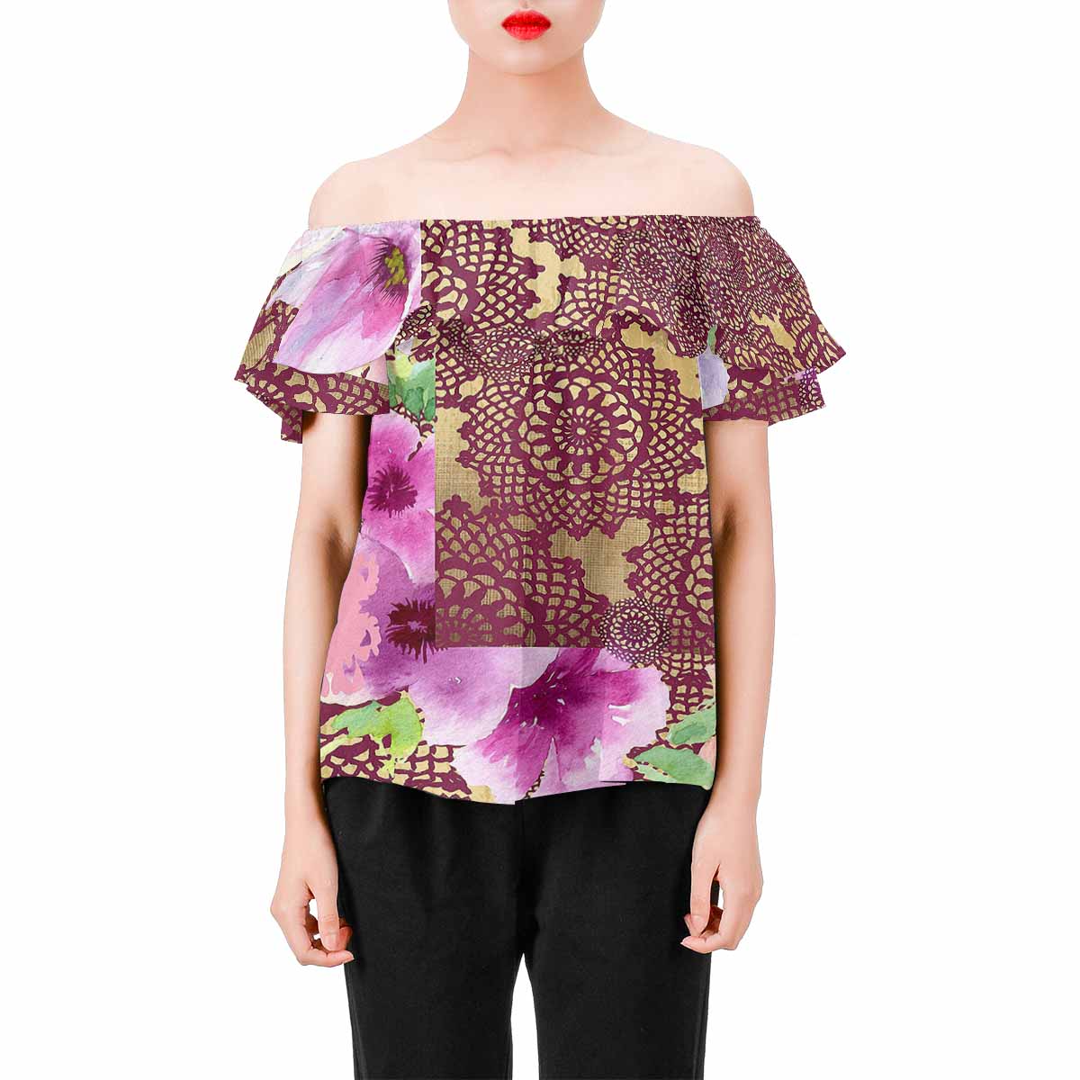 - Off-shoulder blouse with ruffle. Elastic collar finished.