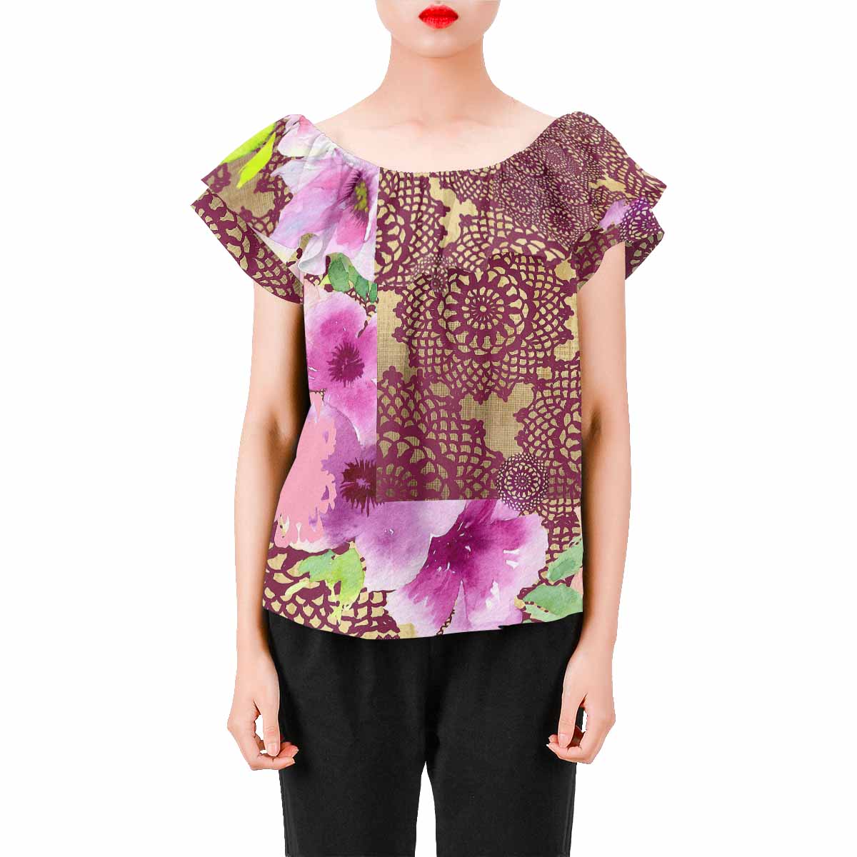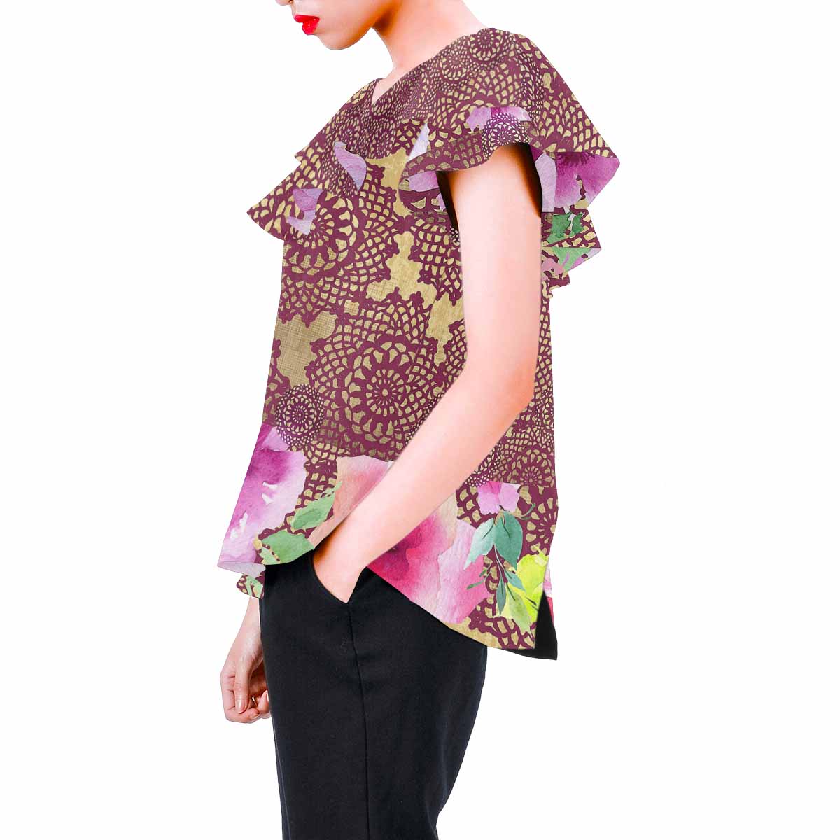 Victorian Lace print Chiffon Blouse, design 13