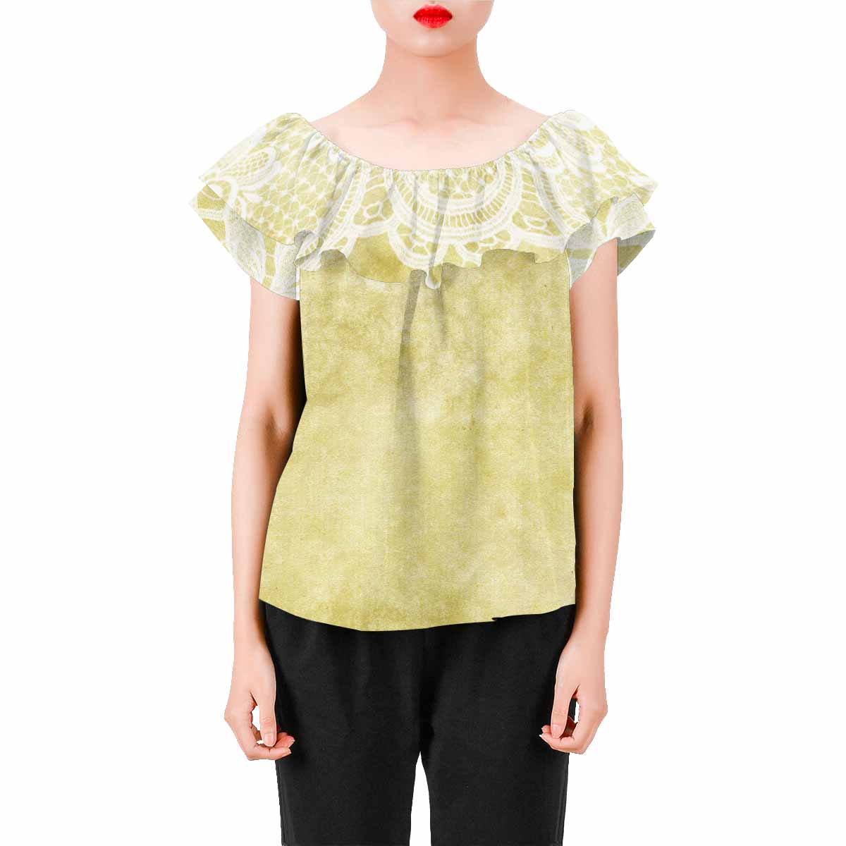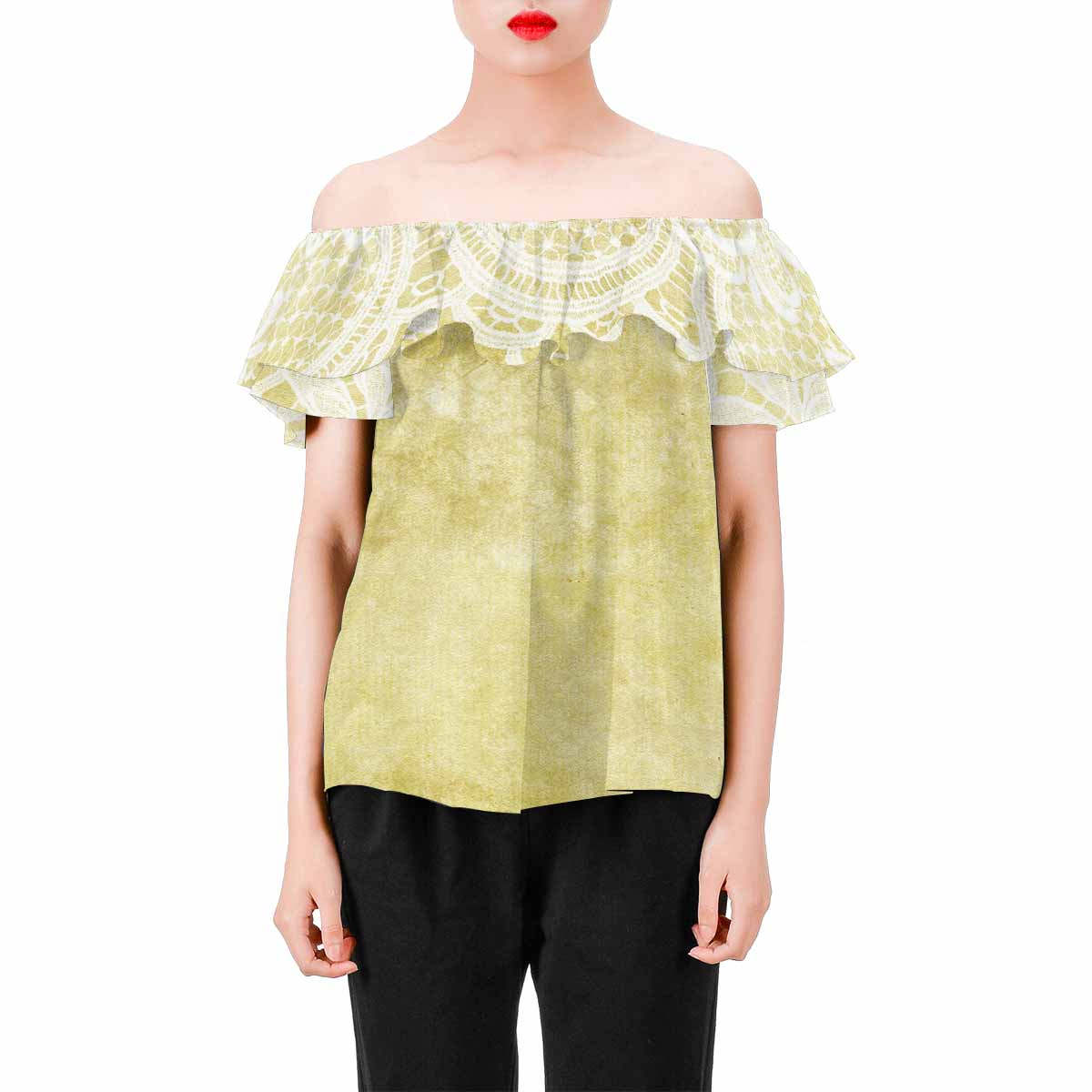 - Off-shoulder blouse with ruffle. Elastic collar finished.