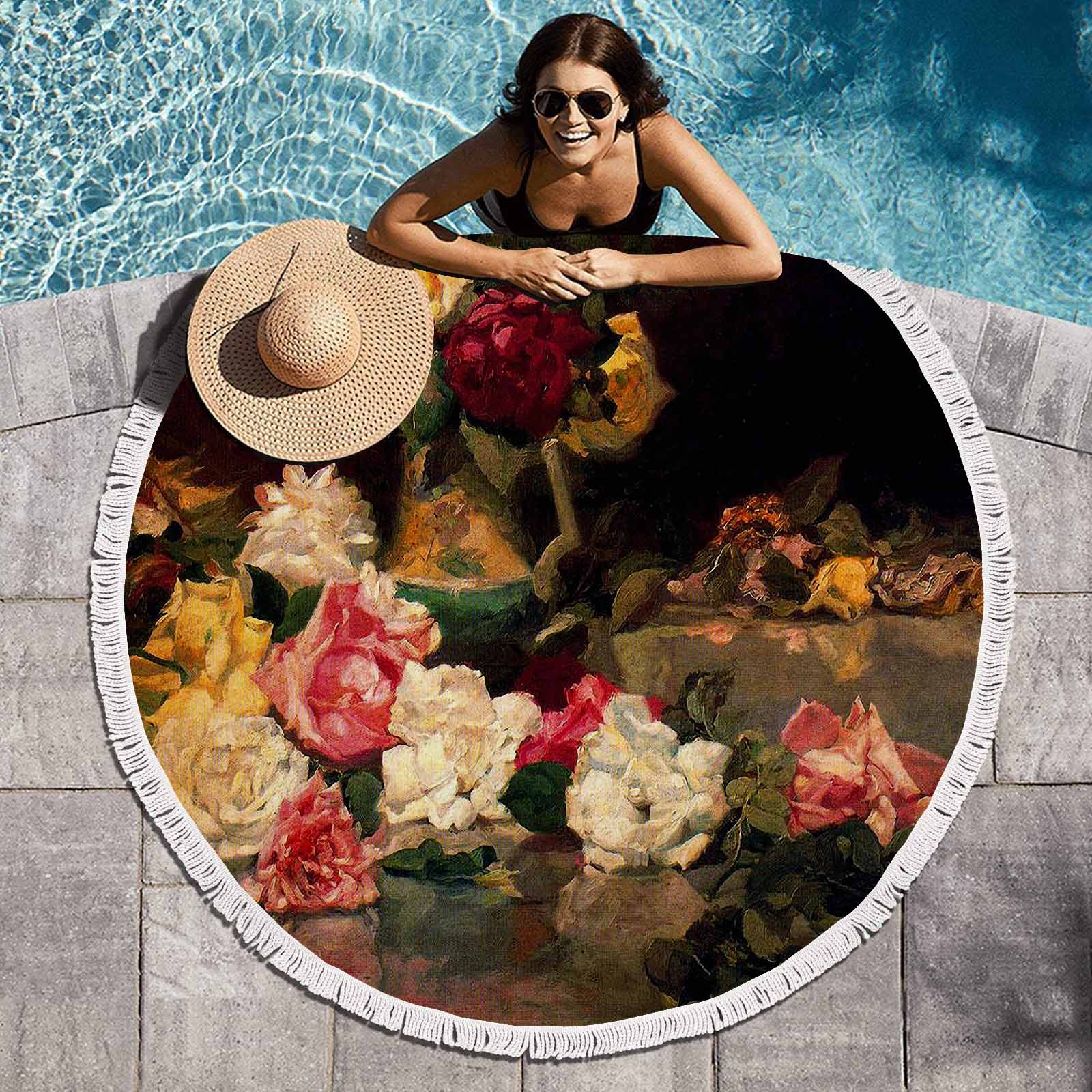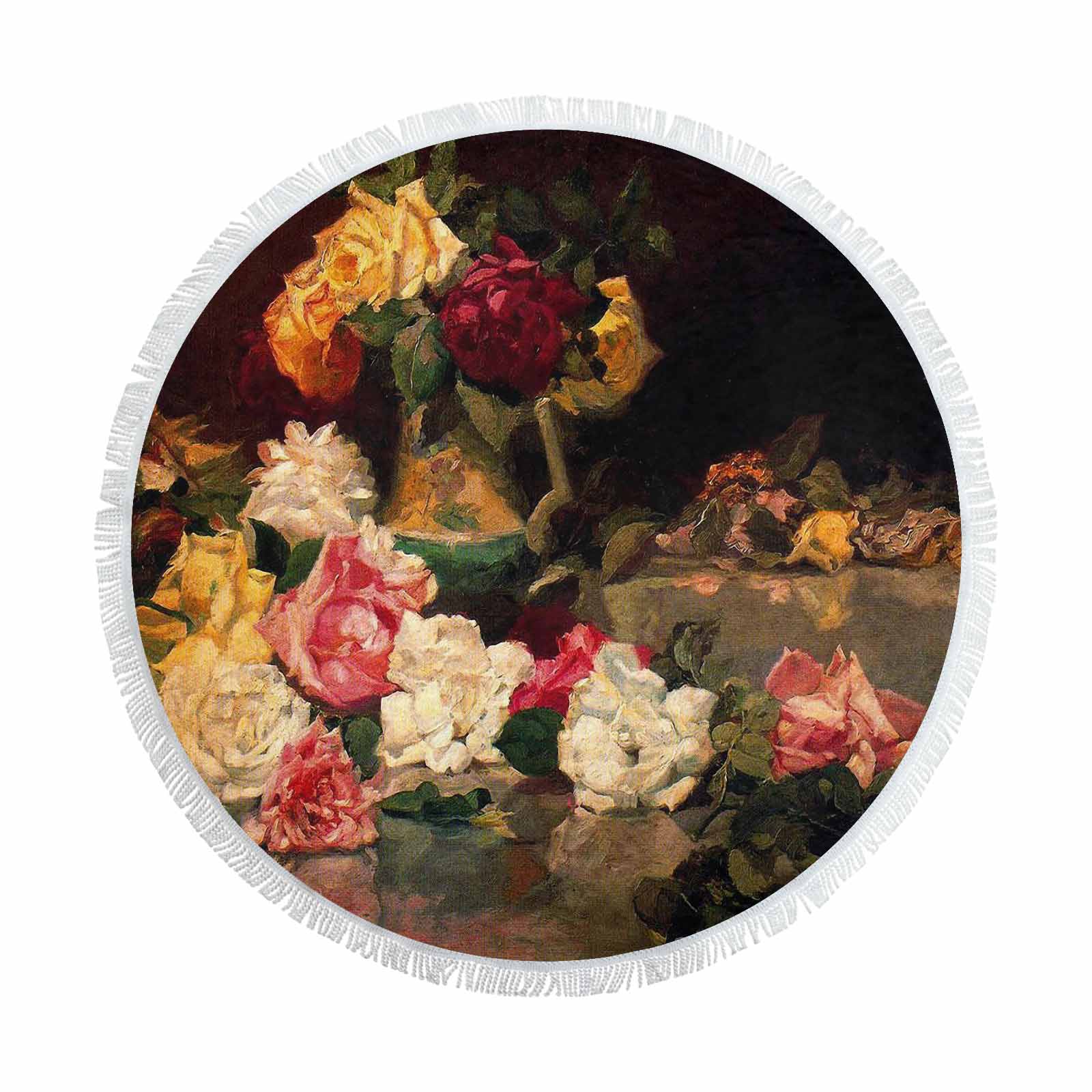 Vintage Floral circular plush beach towel, fringe edges, Design 37