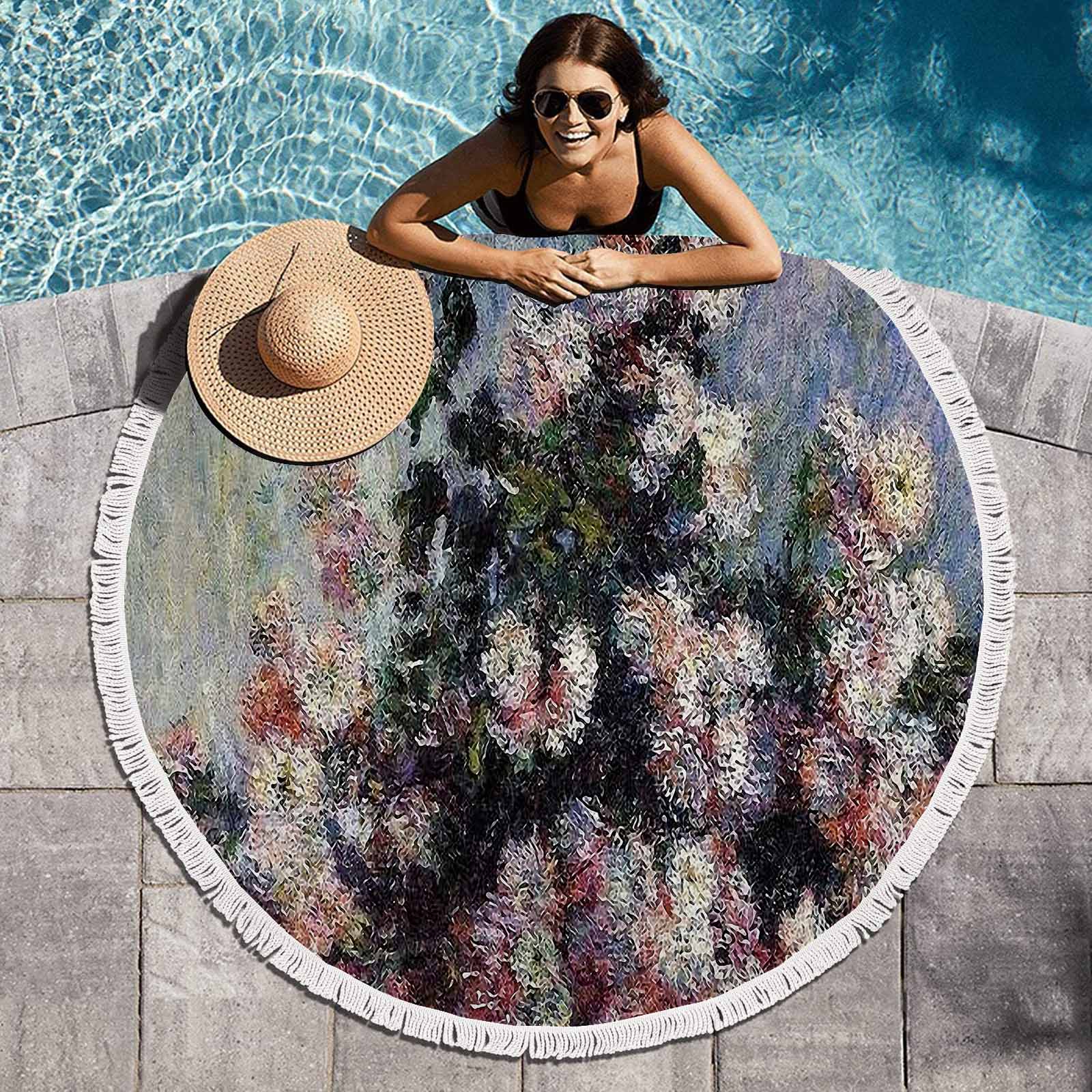Vintage Floral circular plush beach towel, fringe edges, Design 44