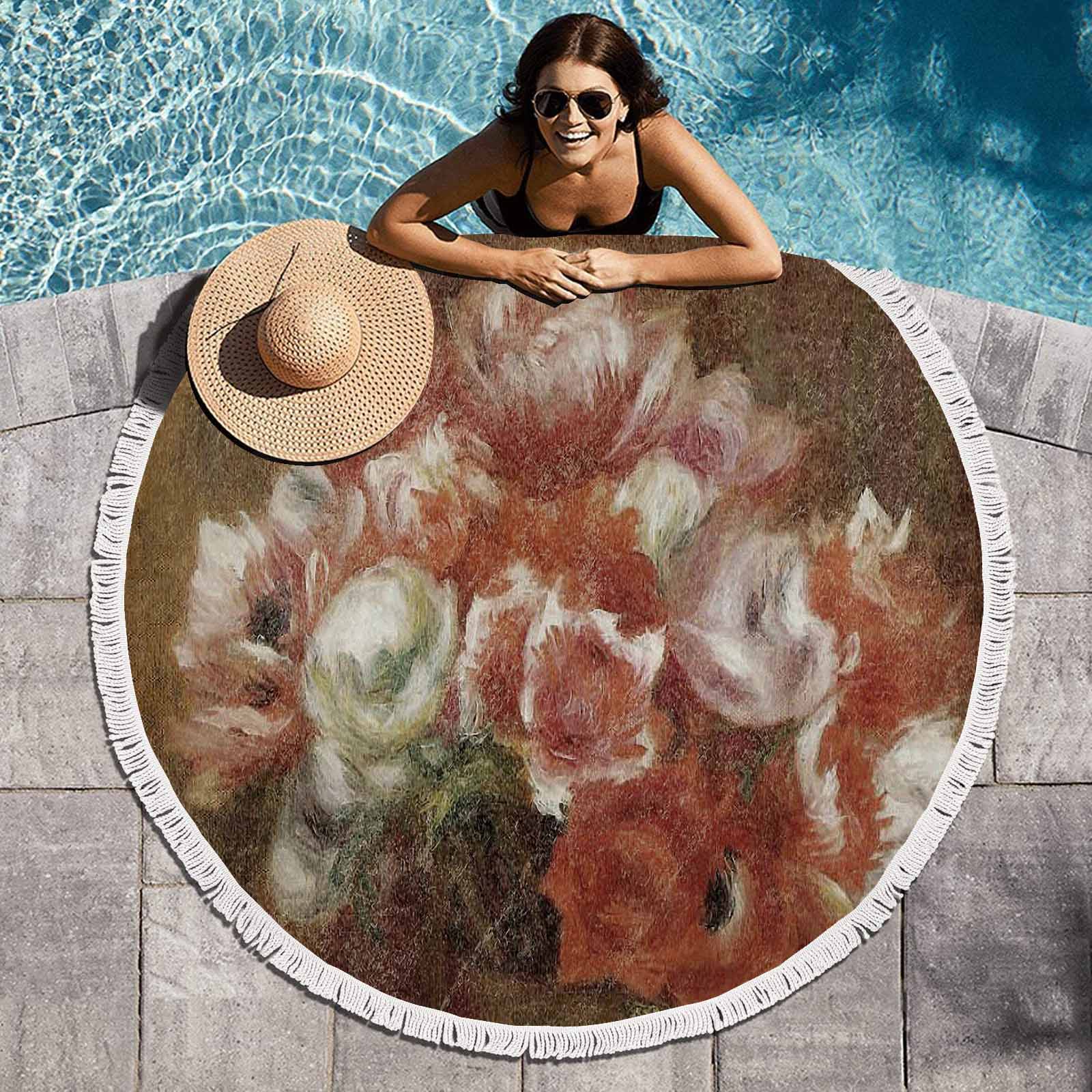 Vintage Floral circular plush beach towel, fringe edges, Design 15