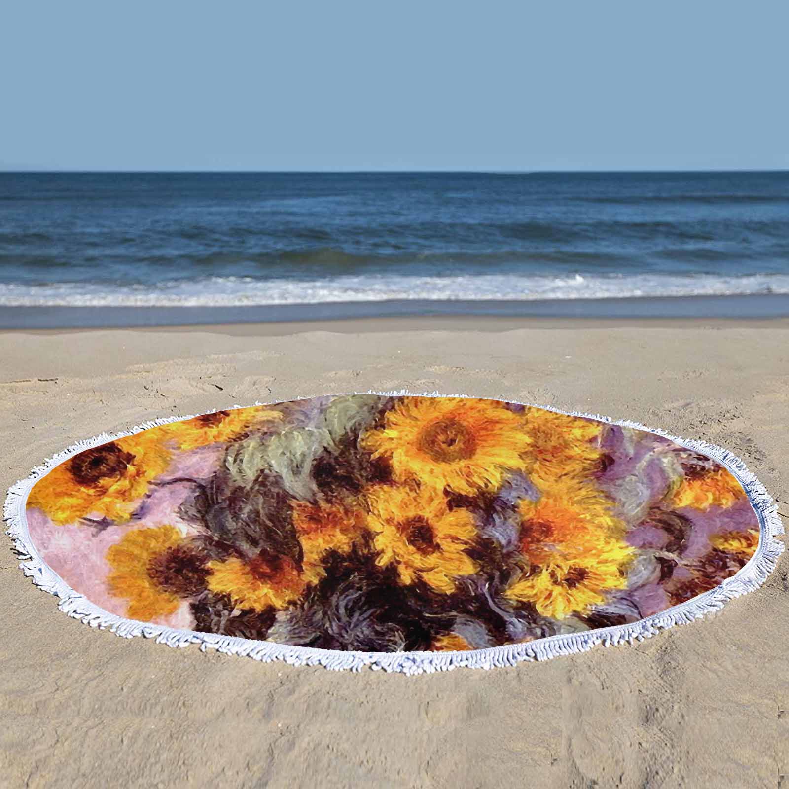 Vintage Floral circular plush beach towel, fringe edges, Design 49