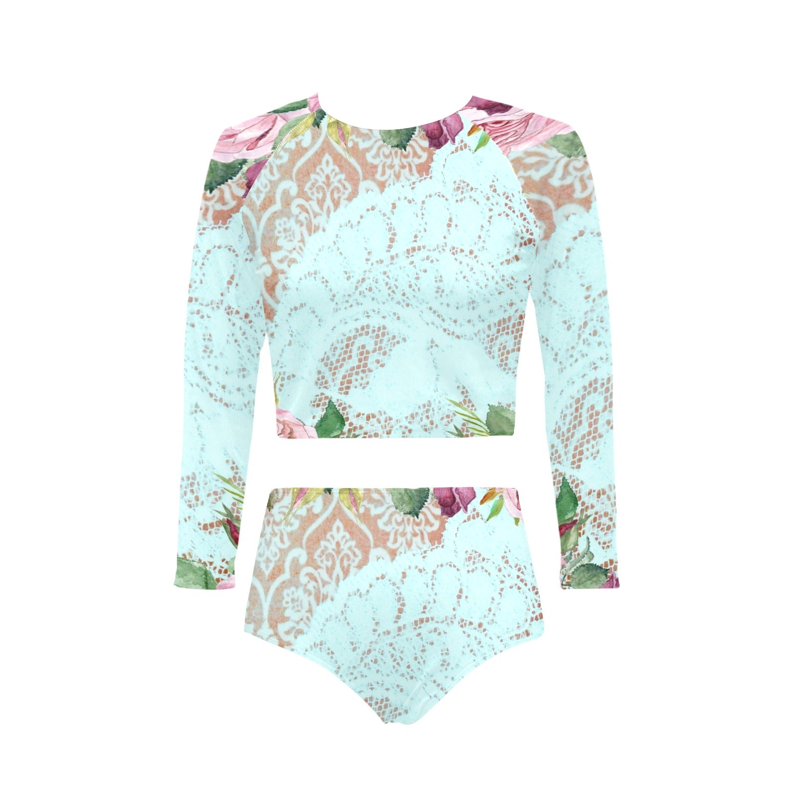 Victorian printed lace, long sleeve 2pc swimsuit, beachwear, design 24 Long Sleeve Bikini Set (Model S27)
