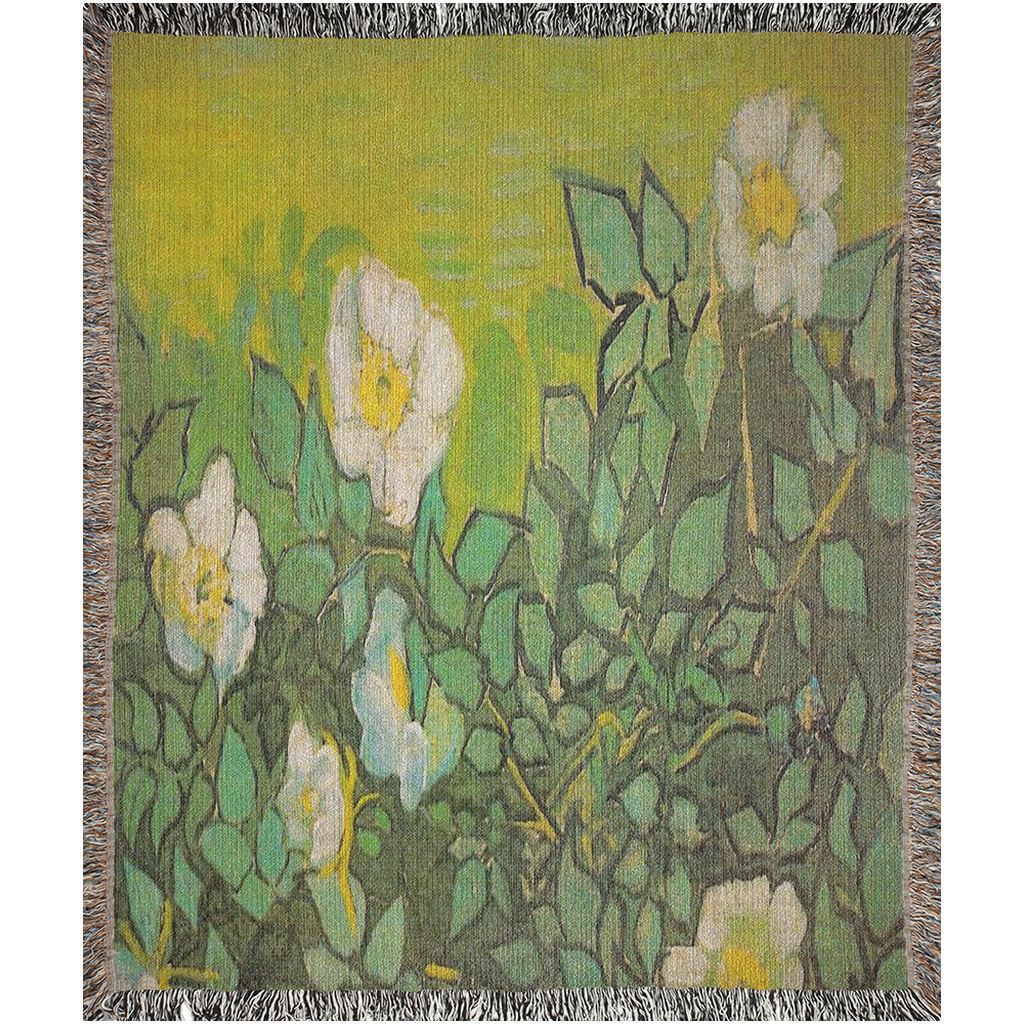 Woven throw blankets utilize solid colored yarn combined with black and white yarn to create image. This type printing is nice for the somewhat faded looks as antique vintage art design should look.