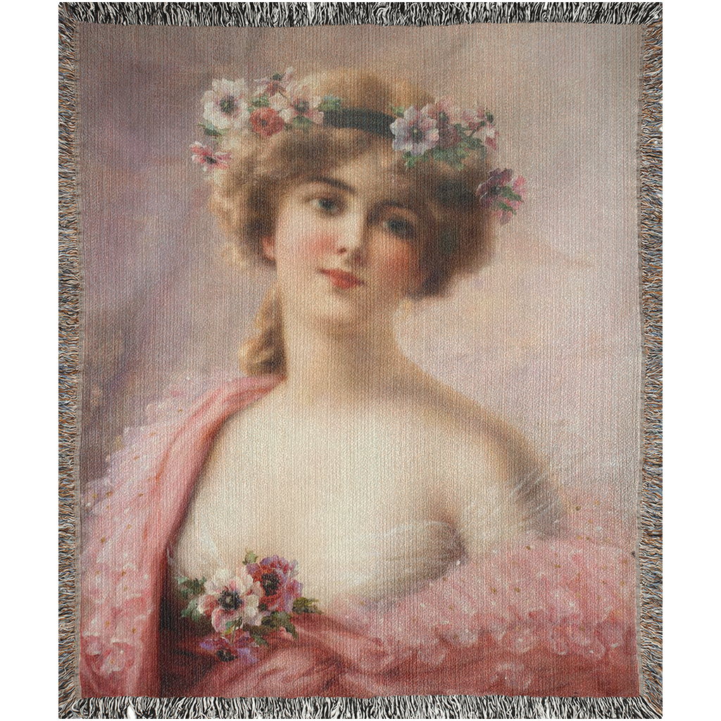 100% cotton Victorian Lady design design woven blanket, 50 x 60 or 60 x 80in, Young Girl with Anemones