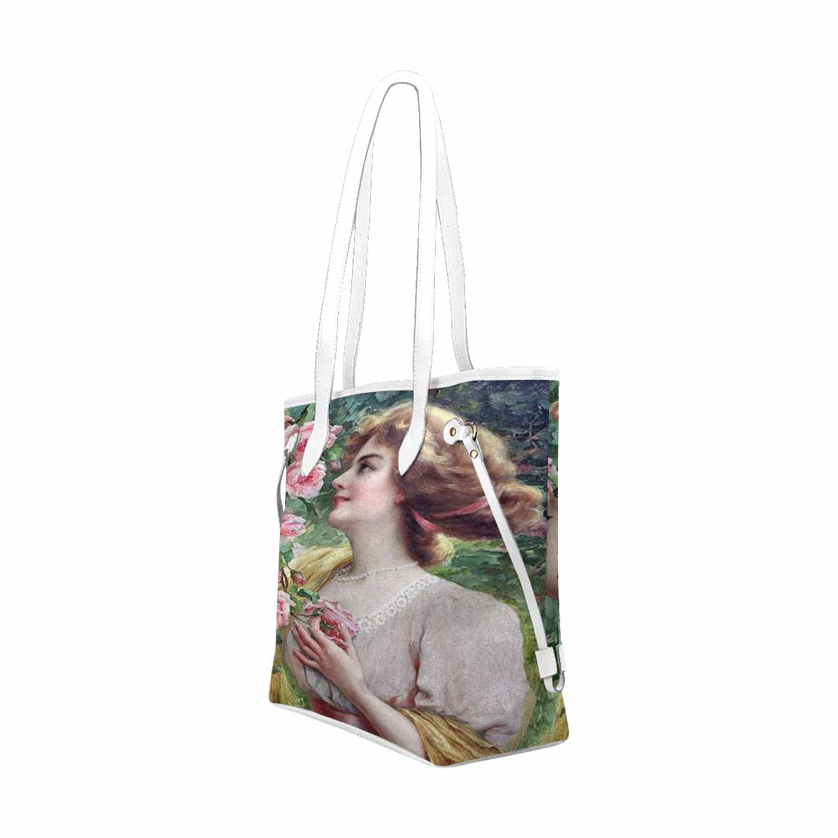 Victorian Lady Design Handbag, Model 1695361, Lady Picking A Pink Rose, WHITE TRIM