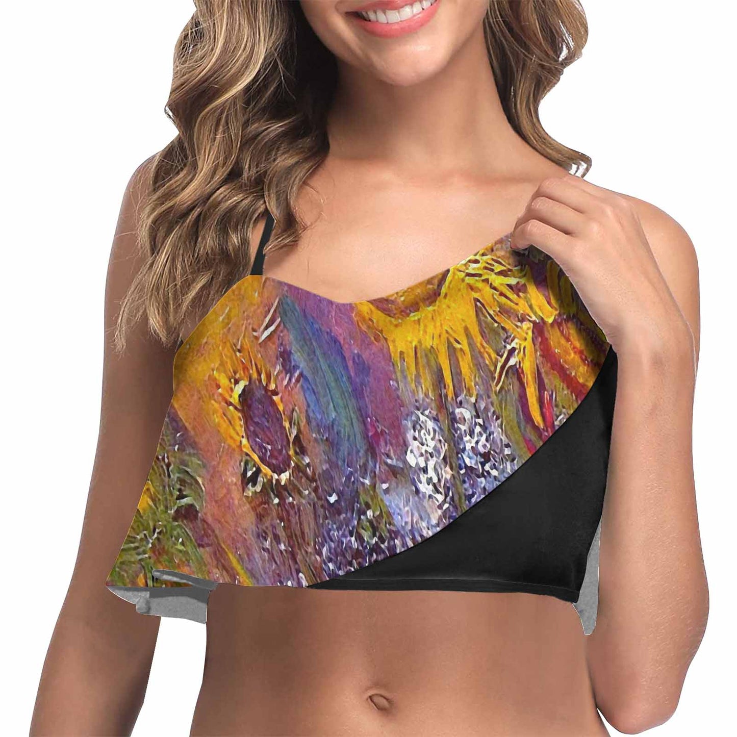 - The swimsuit top is flounce design.