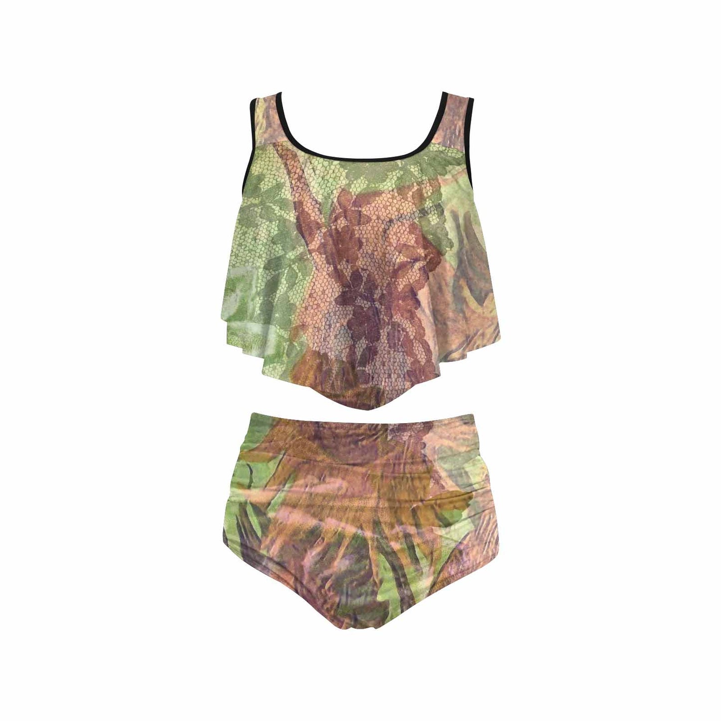 - Features the ruffle flounce top and high-waisted bottom.